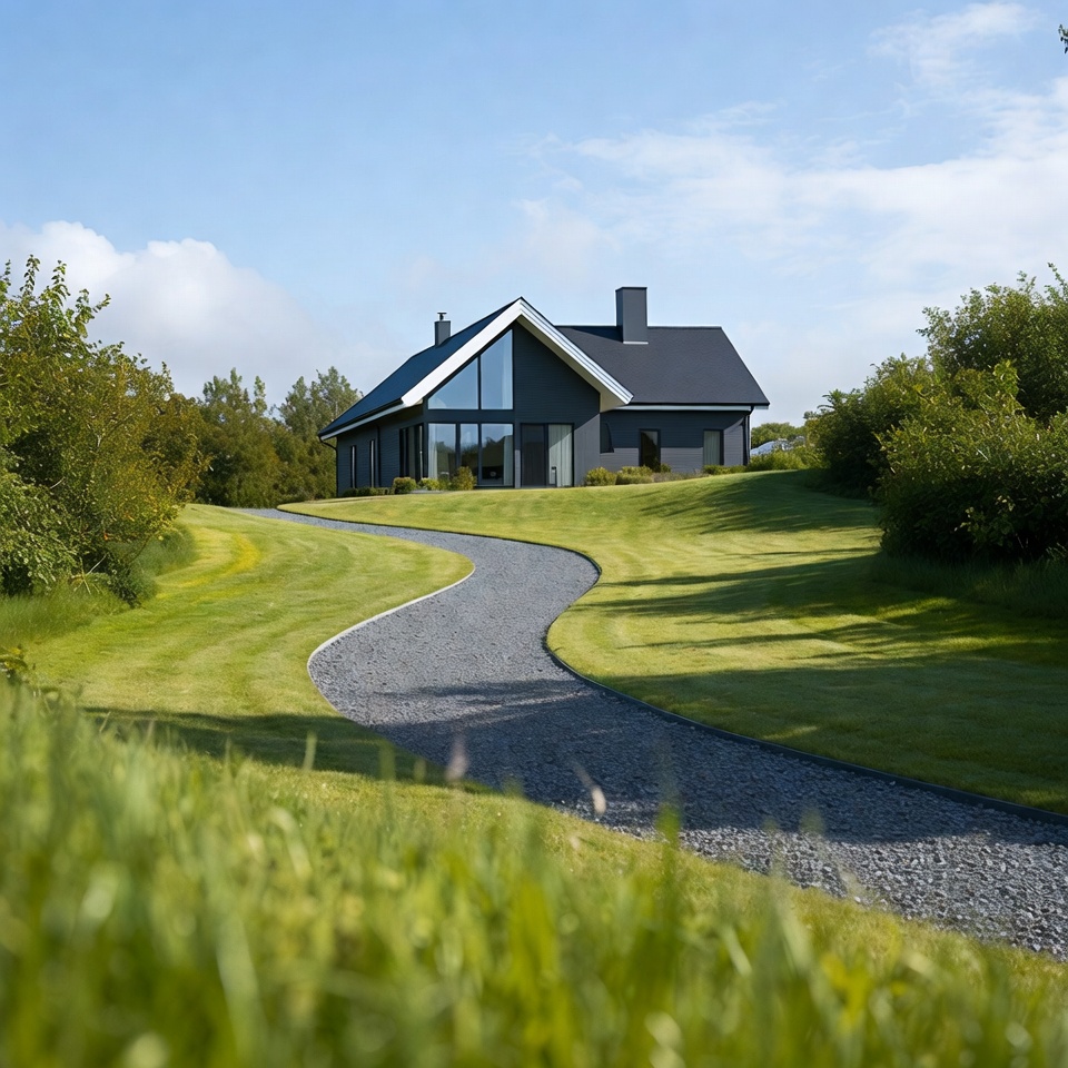 A house sits on a spacious lawn surrounded by greenery. A winding path leads to the entrance. The setting is bright and sunny.