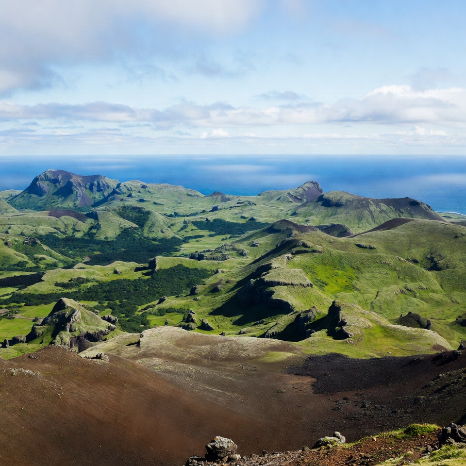 adventure, coastline, daytime, exploration, flora, green, hills, land, landscape, mountains, nature, ocean, outdoor, scenery, scenic, sky, terrain, travel, view, wilderness