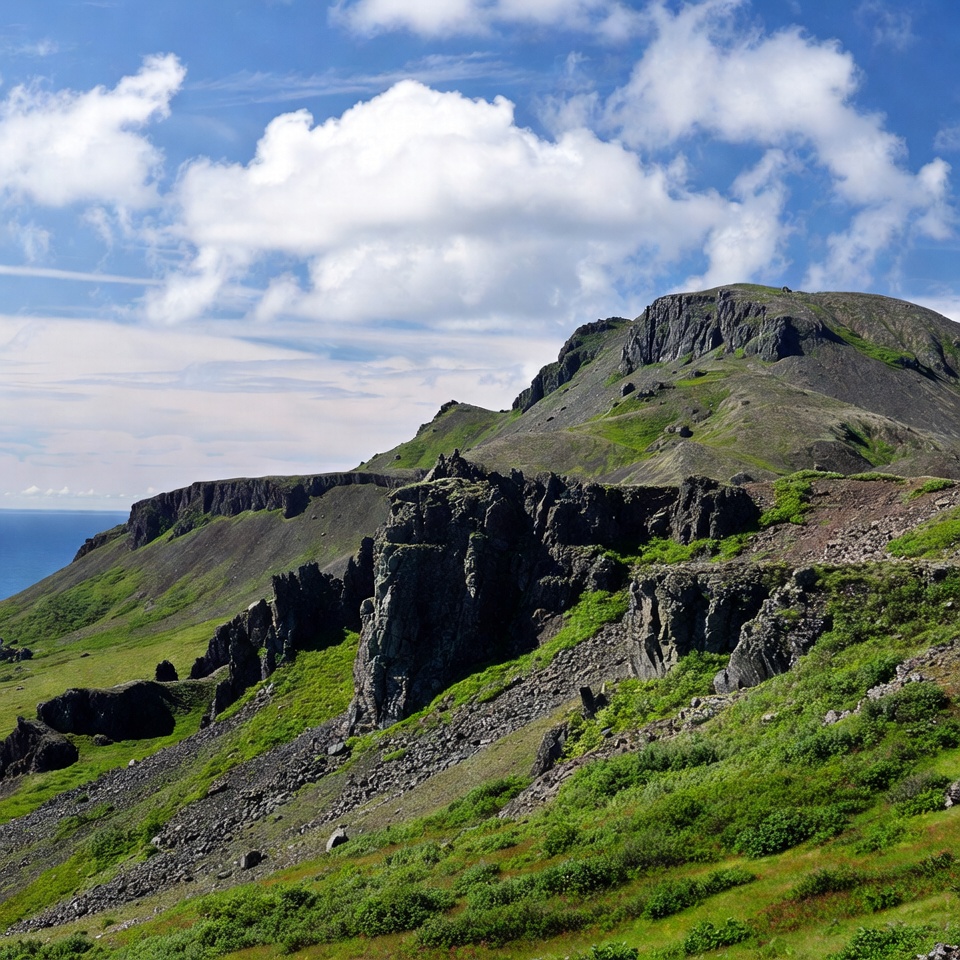 clouds, coastline, daylight, geology, green, hills, island, landform, landscape, natural, nature, ocean, outdoor, rocks, scenery, sky, summer, terrain, view, wilderness
