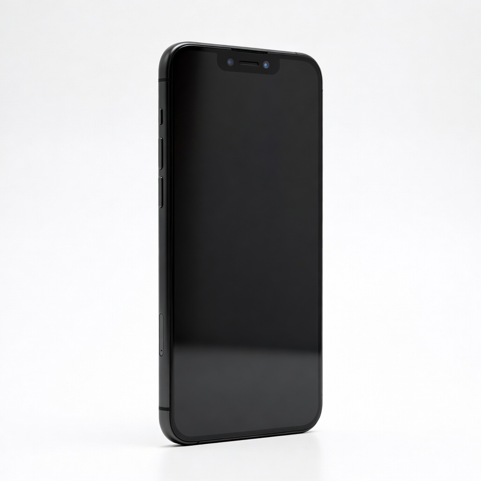 A black smartphone stands upright on a plain background, displaying a blank screen. It has buttons on the side and a clean design.