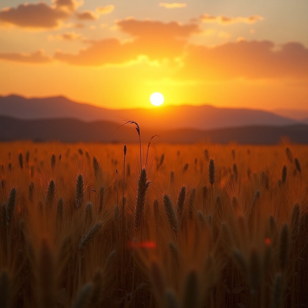Wheat stalks stand tall in a field as the sun sets behind distant hills. The warm light fills the sky with orange hues.