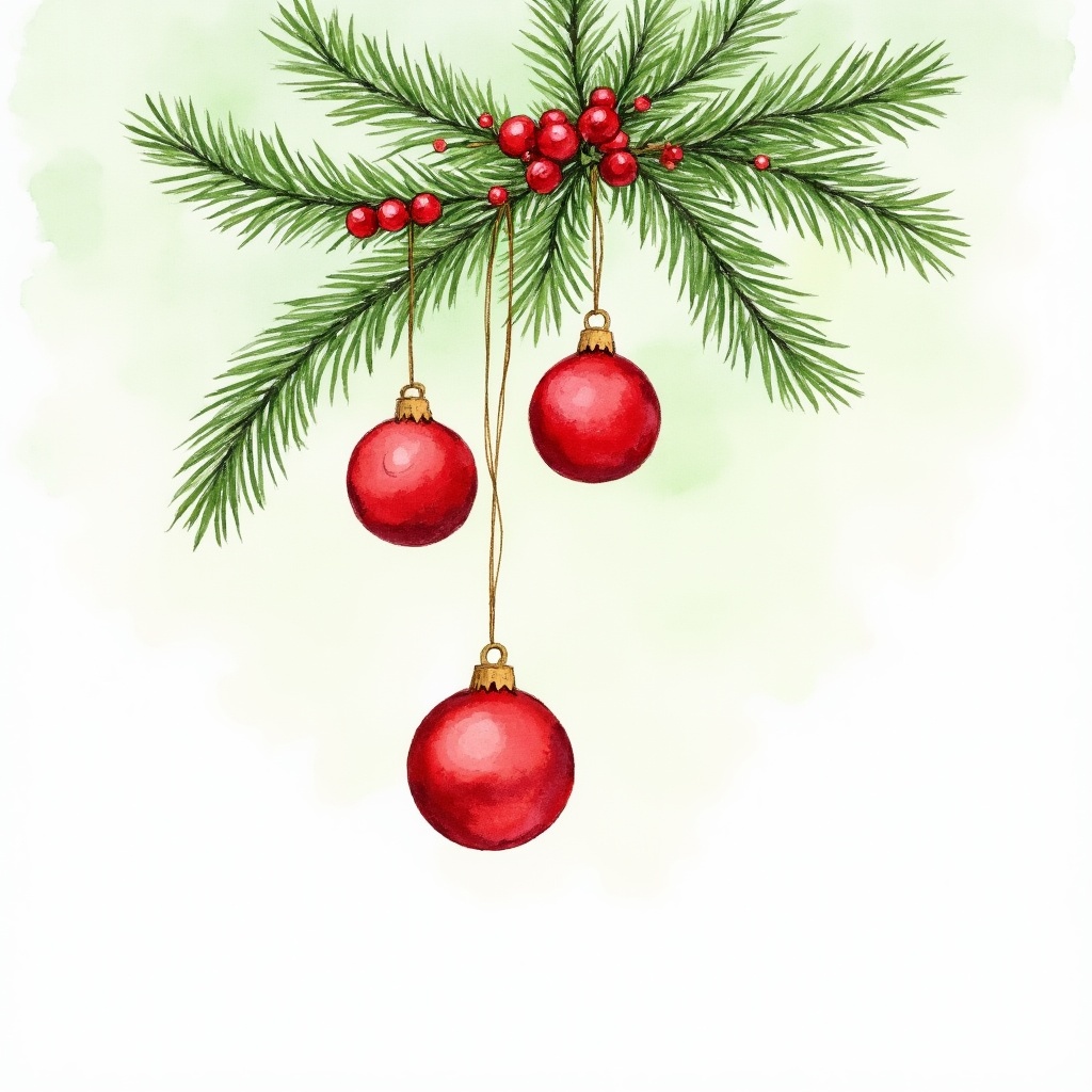A pine branch holds three red ornaments and bright berries, creating a festive scene for the holiday season with a soft light background.