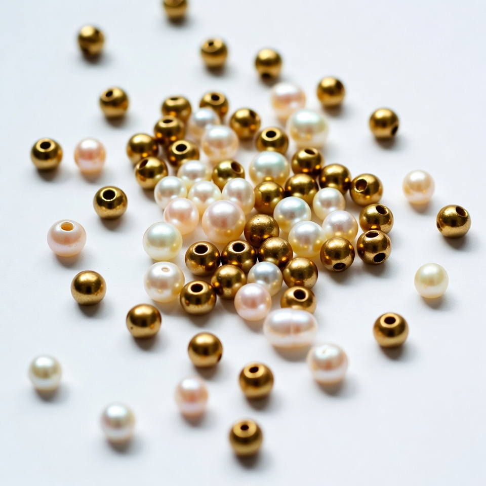 Various beads are scattered on a flat surface. They include shiny gold and white options, showing a mix of shapes and sizes.