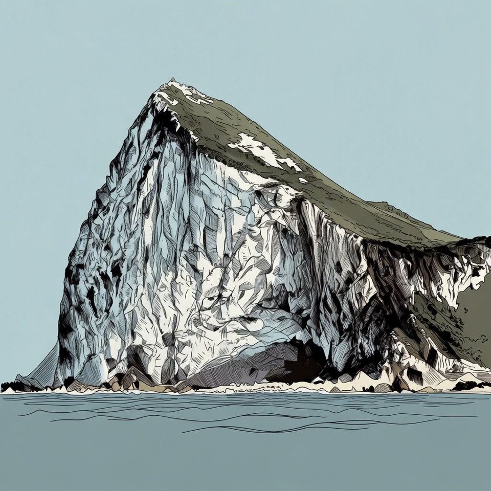 A large rock formation rises sharply from calm water under a clear sky. The scene captures natural textures and shapes in a coastal setting.