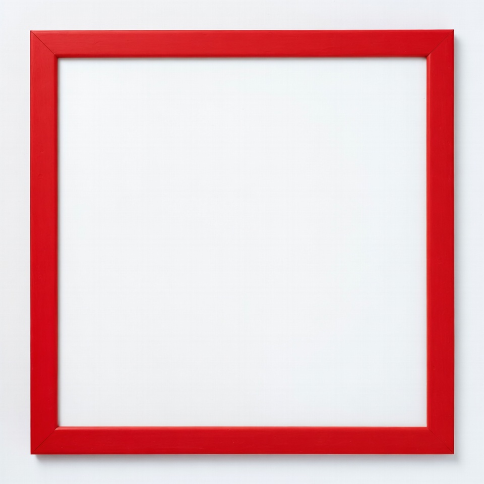 A red frame hangs on a white wall, waiting for a picture or artwork to be placed inside. It has a simple design with no image.