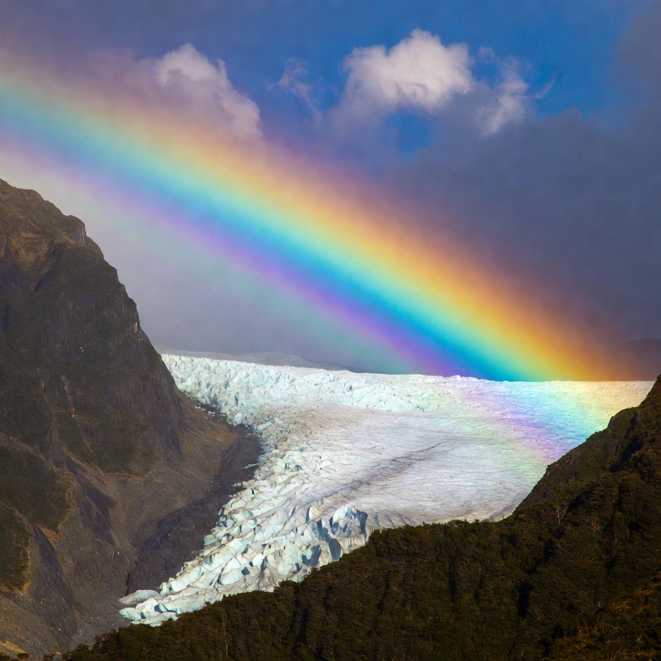 adventure, beauty, blue sky, clouds, color, daylight, environment, glacier, ice, landscape, mountain, natural phenomenon, nature, outdoor, peak, rainbow, rocky terrain, scenic view, tranquility, weather