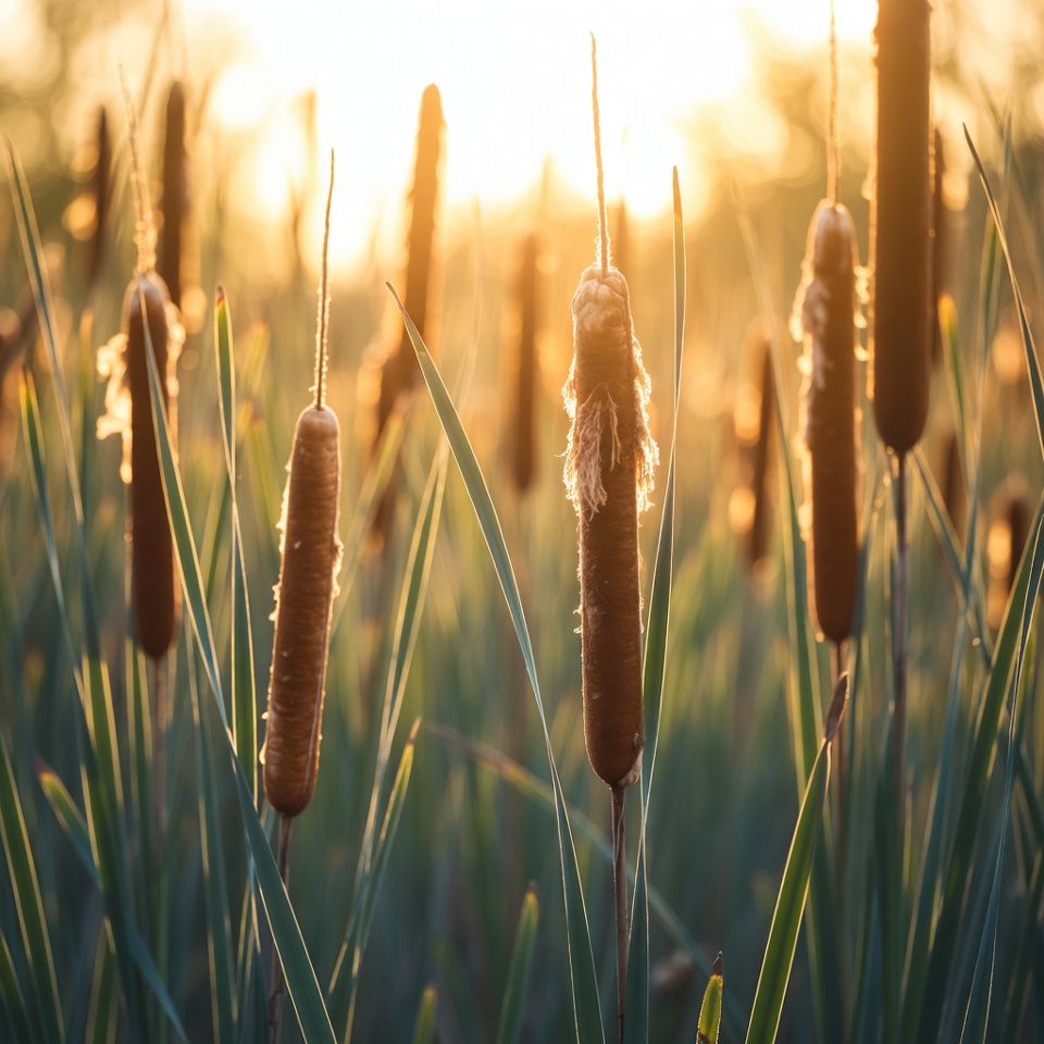 bright, cattails, evening, field, flora, growing, landscape, marshlands, nature, organic, outdoors, peaceful, plants, rural, scenery, sunlight, sunset, tall grass, vegetation, warm light