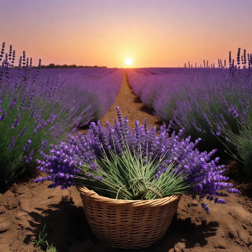 A basket filled with lavender sits in a field during sunset. Purple flowers stretch across the land, marking the end of the day.