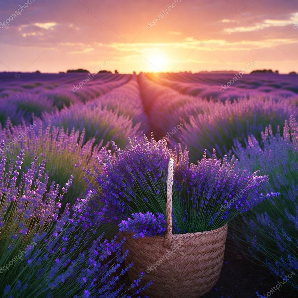 A basket filled with lavender sits in a field. The sunset casts a warm light over the blooming lavender plants.