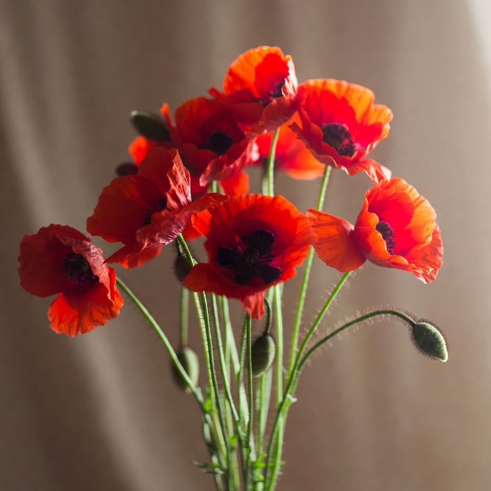 A bouquet of red poppies stands in a vase. The flowers are vibrant and open, with some closed buds nearby.