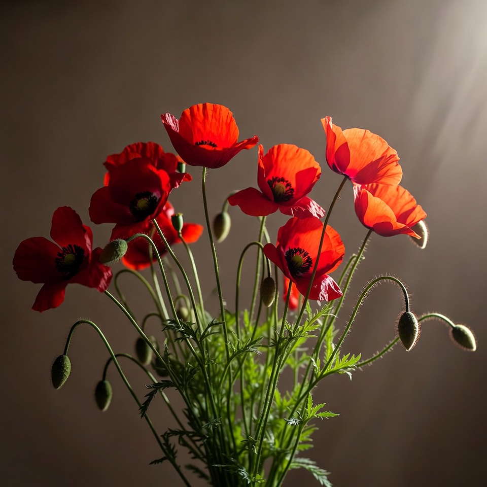 A bouquet of red poppies stands tall against a gently lit background. Green stems support the flowers as they bloom.