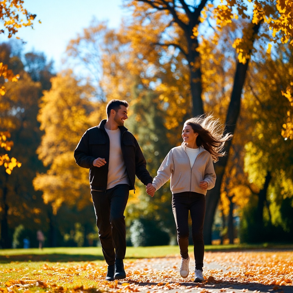 autumn, cheerful, companionship, couple, exercise, friendship, happiness, leaves, leisure, love, nature, outdoor, park, path, season, sunlight, together, trees, walking, young
