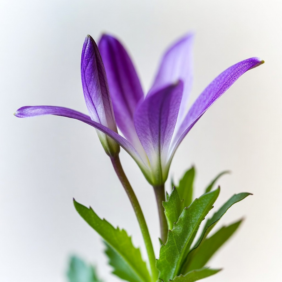 A purple flower stands tall with green leaves around it. The soft lighting highlights the flower's details and colors.