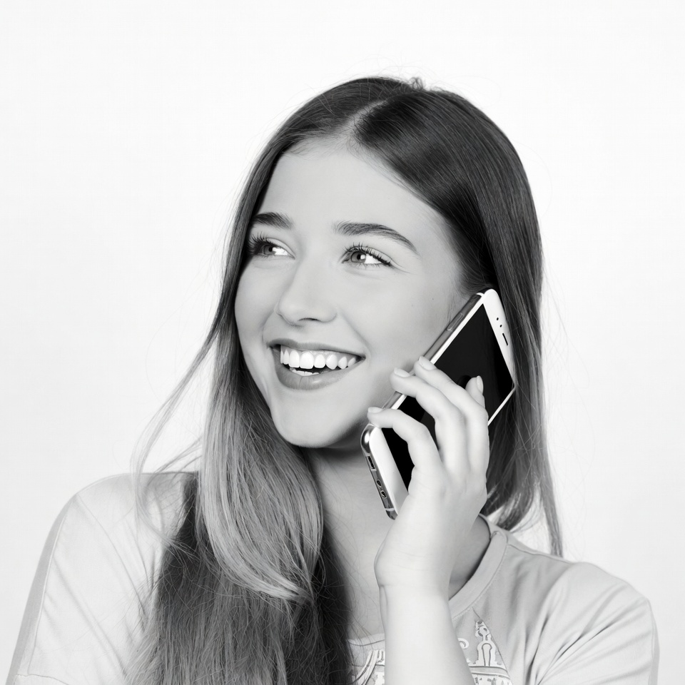 A young woman smiles while talking on her phone. She has long hair and appears happy during the conversation.
