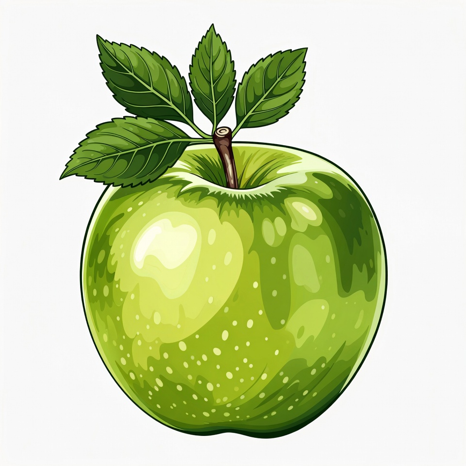 A fresh green apple is shown with a branch and leaves. The apple's surface is shiny and smooth. Light reflects off the fruit's skin.