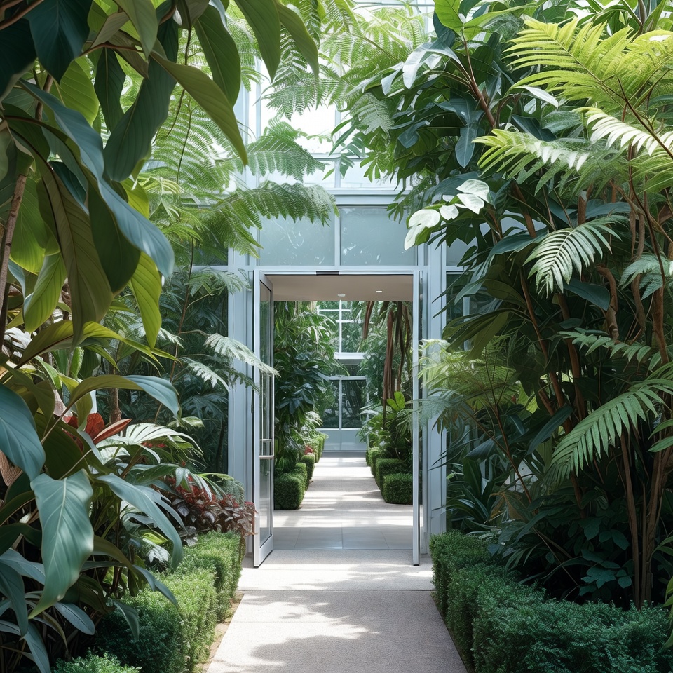 decor, design, entrance, environment, flora, garden, garden center, glass building, greenery, indoor, landscape, leaves, nature, pathway, peaceful, plants, relax, structure, sunlight, tropical