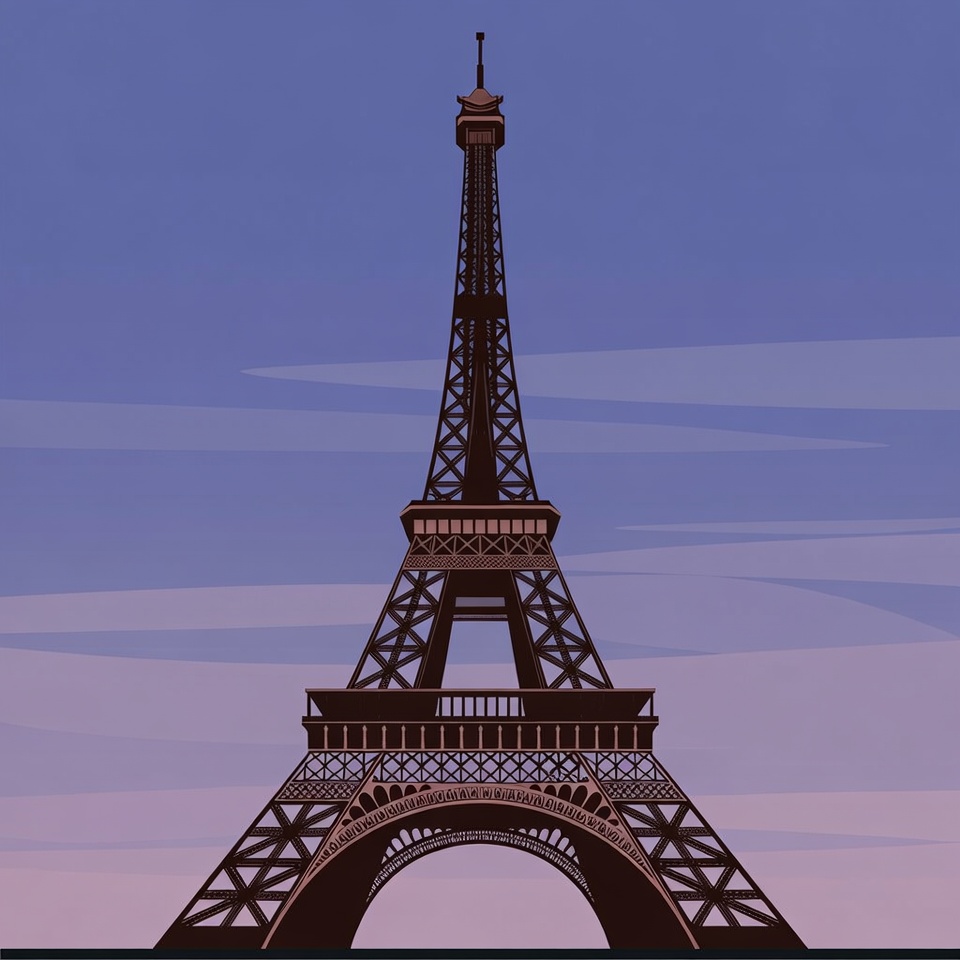 The Eiffel Tower stands tall against a colorful sunset sky. The scene captures the iconic structure in a clear and simple design.