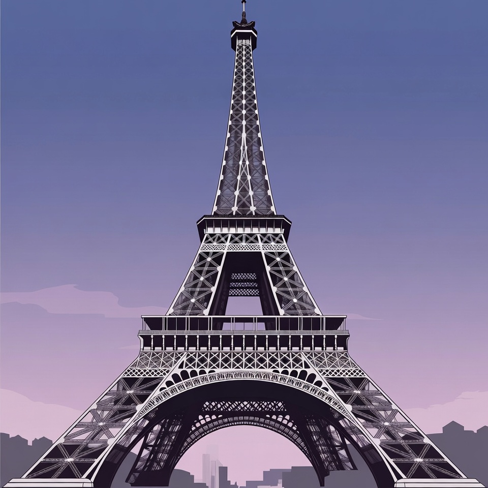 Eiffel Tower stands tall against a purple sky at dusk, capturing the attention of viewers in Paris. The details of the structure are prominent.