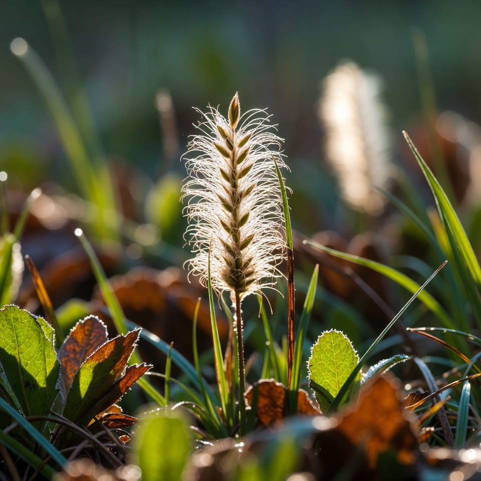 Wild grass shines in the morning light, surrounded by green leaves and brown foliage. The scene shows nature waking up for the day.