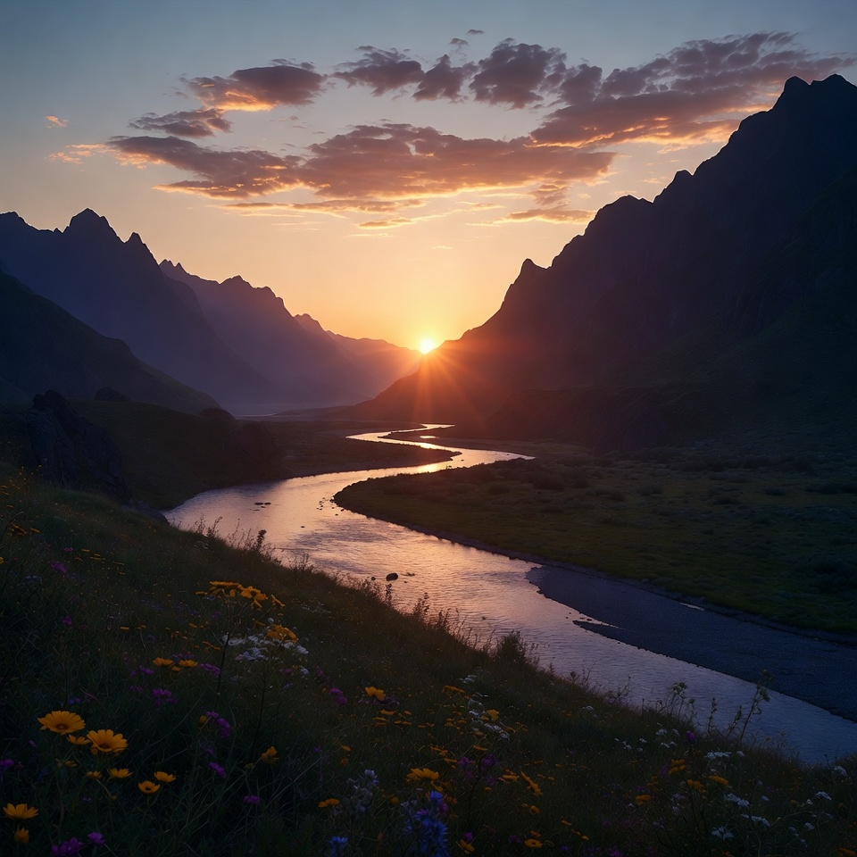 Sunset casts warm light on mountains and river. Flowers bloom along the banks, highlighting the ending of the day in nature.