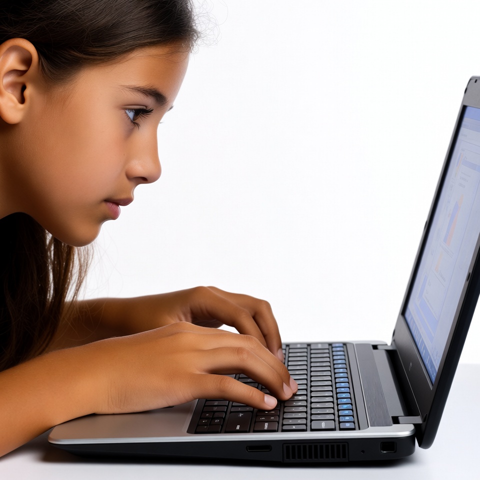 A young girl types on a laptop with focus. She is at home, engaged in her work or studies. The setting is simple and bright.