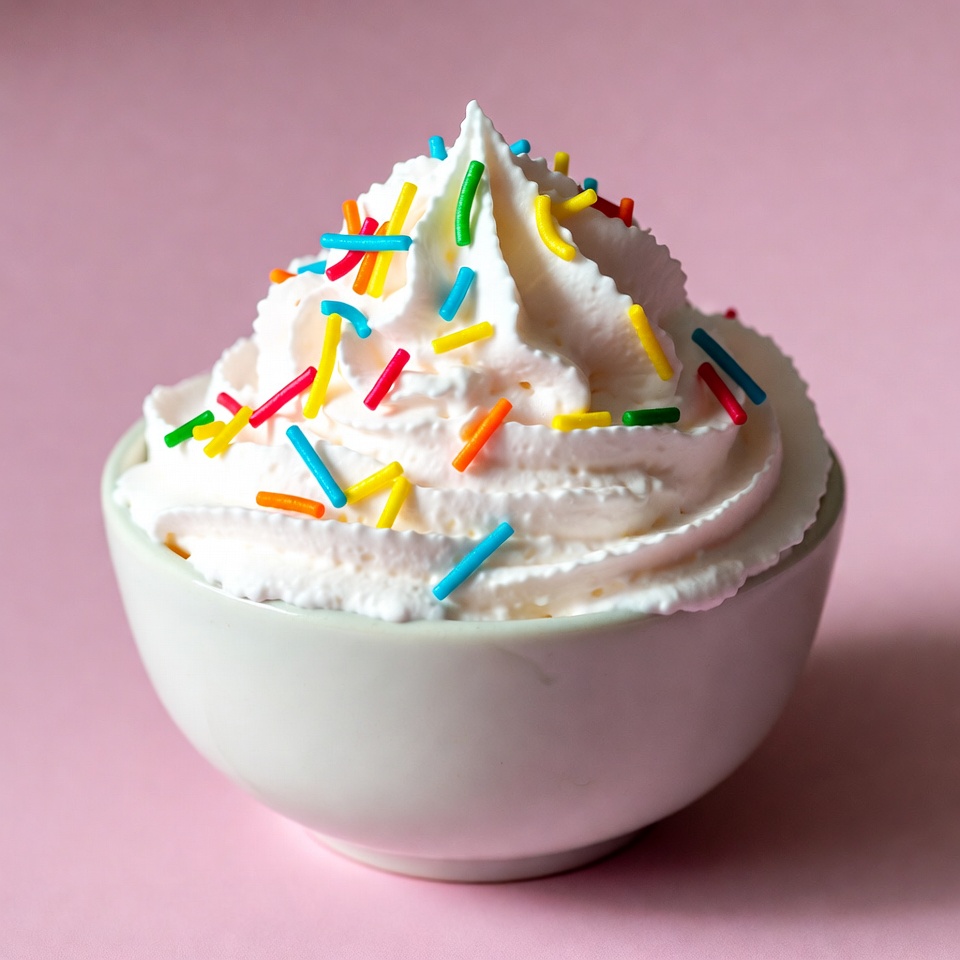 A bowl holds a large swirl of whipped cream topped with bright sprinkles. The scene is set against a pink background.