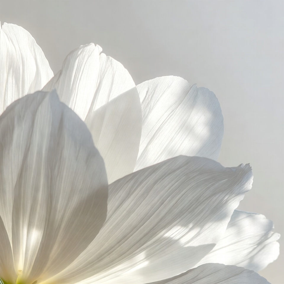 A close view of a white flower showing its soft petals. The light highlights the texture and details of the petals.