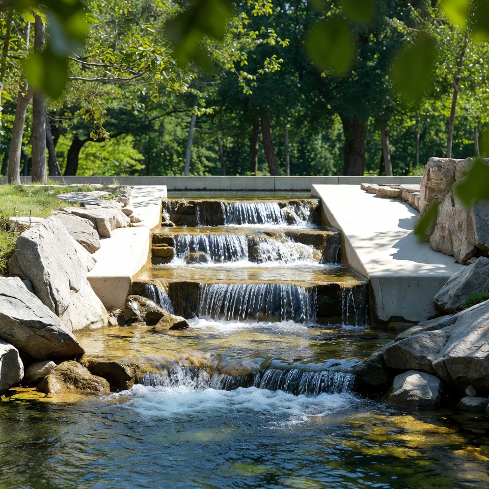 city park, flowing water, green space, landscape, natural feature, nature, outdoor, park activity, recreation area, relaxation, rocks, serene spot, stone steps, stream, summer day, sunlight, trees, water flow, waterfall, winding water