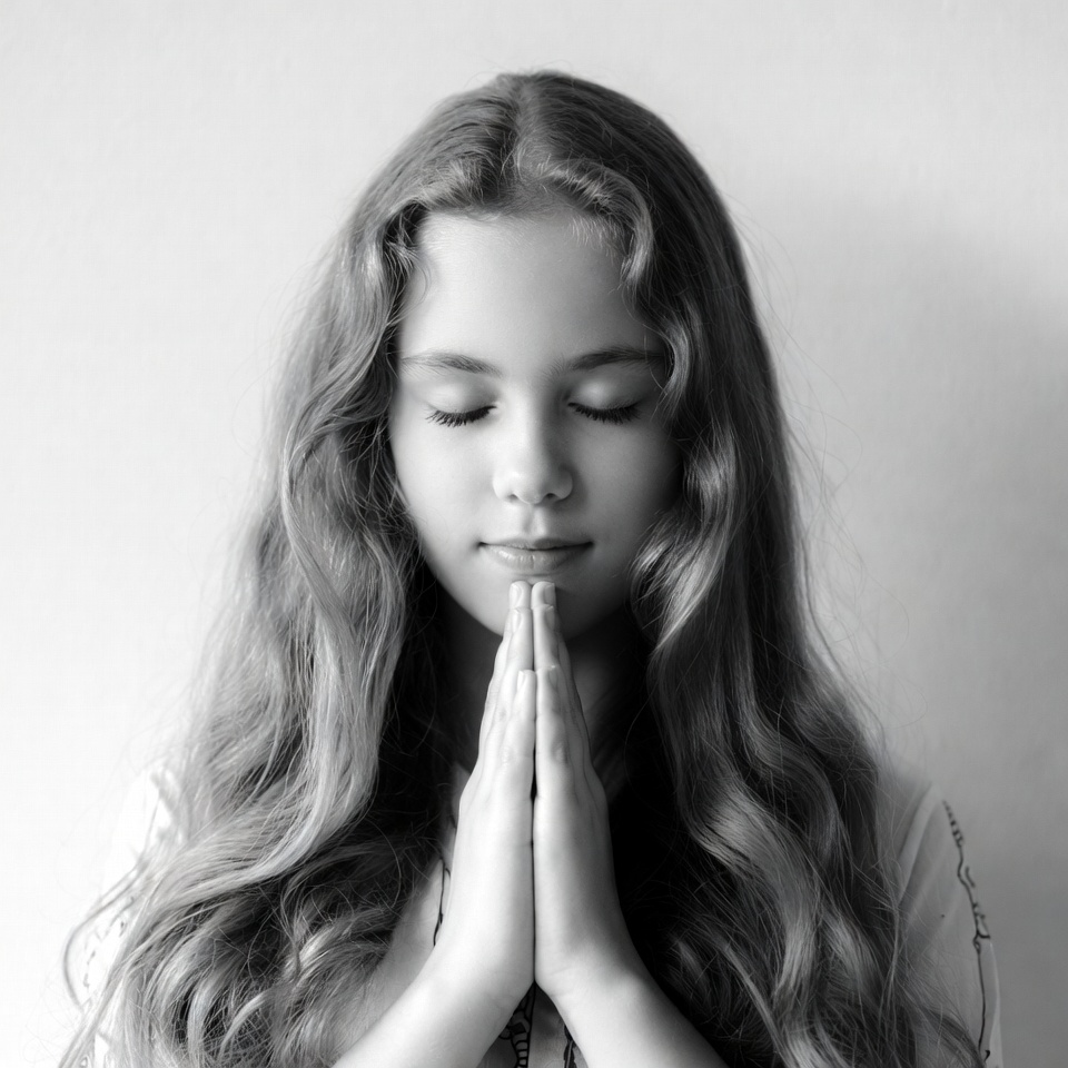 A young girl stands with her hands together, eyes closed, showing a moment of reflection or prayer in a simple indoor setting.