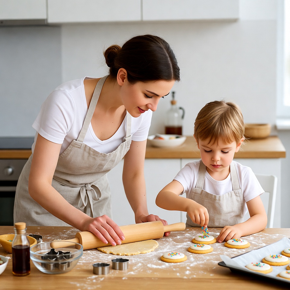 A mother and her young son are baking cookies together in a kitchen. They roll dough and add decorations to the cookies.