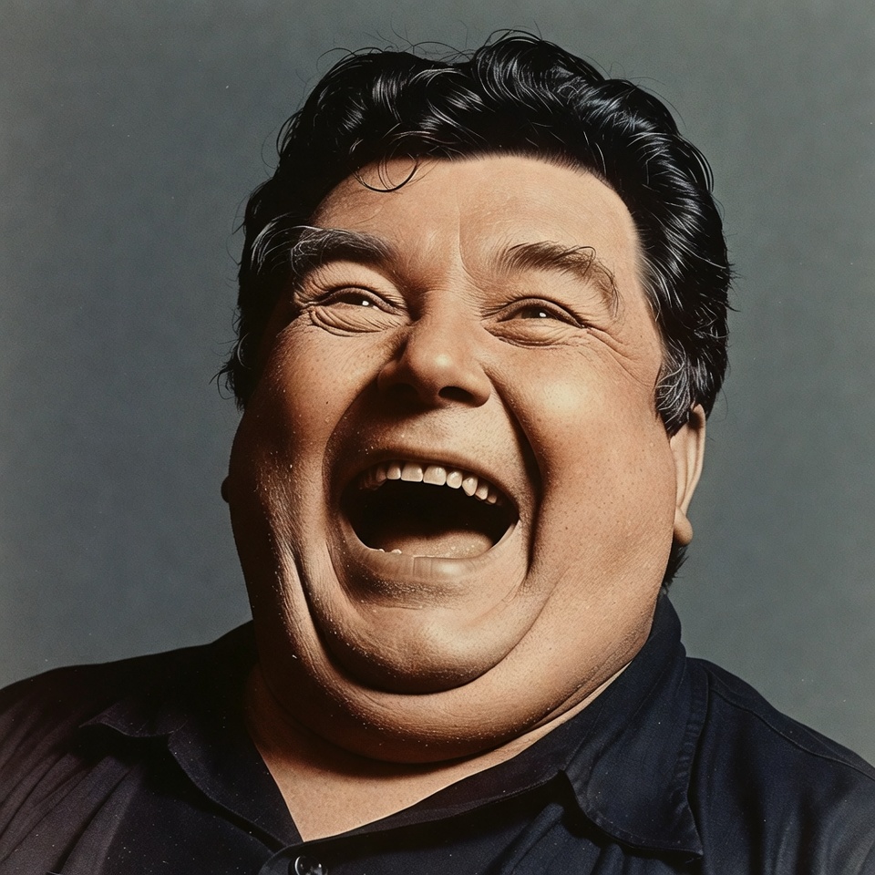 A man is laughing heartily. He has curly hair and a joyful expression. The background is simple and plain.