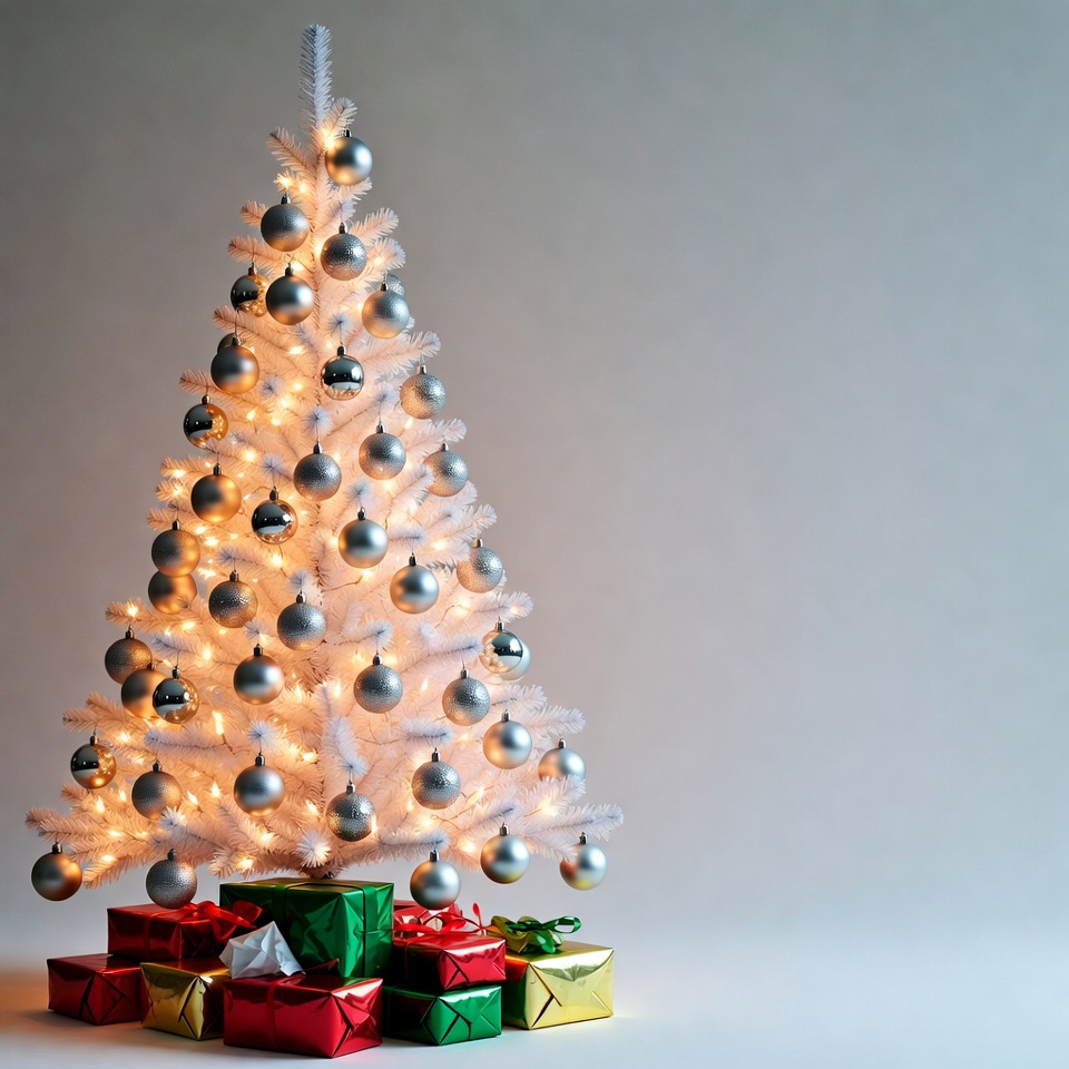 A decorated white Christmas tree stands in a room. It has shiny ornaments and bright lights. Colorful gifts are placed below the tree.