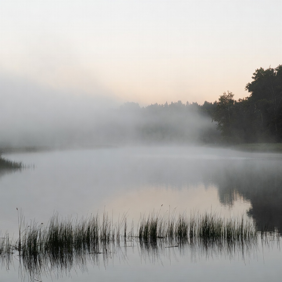 Fog blankets the surface of a calm lake during early morning hours. Grasses grow along the shoreline in soft light.
