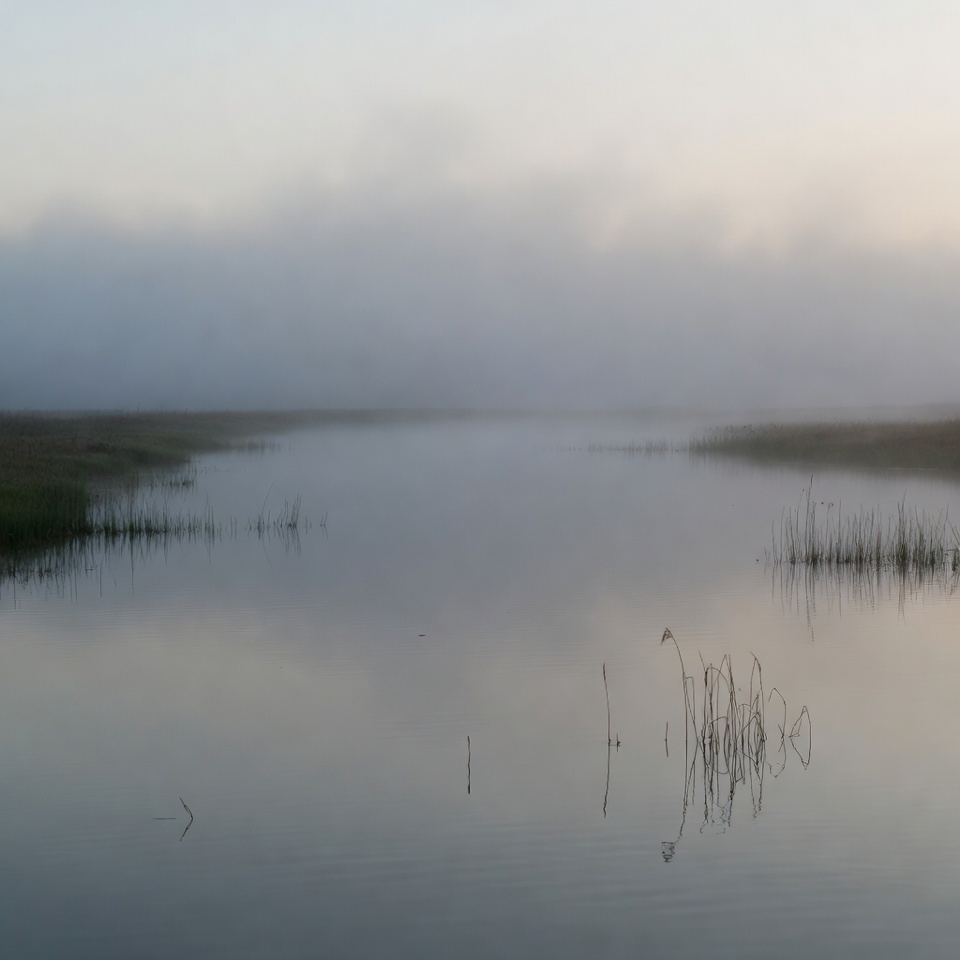 Fog covers the water surface early in the morning. Grasses stick out of the water. The scene shows stillness and nature.