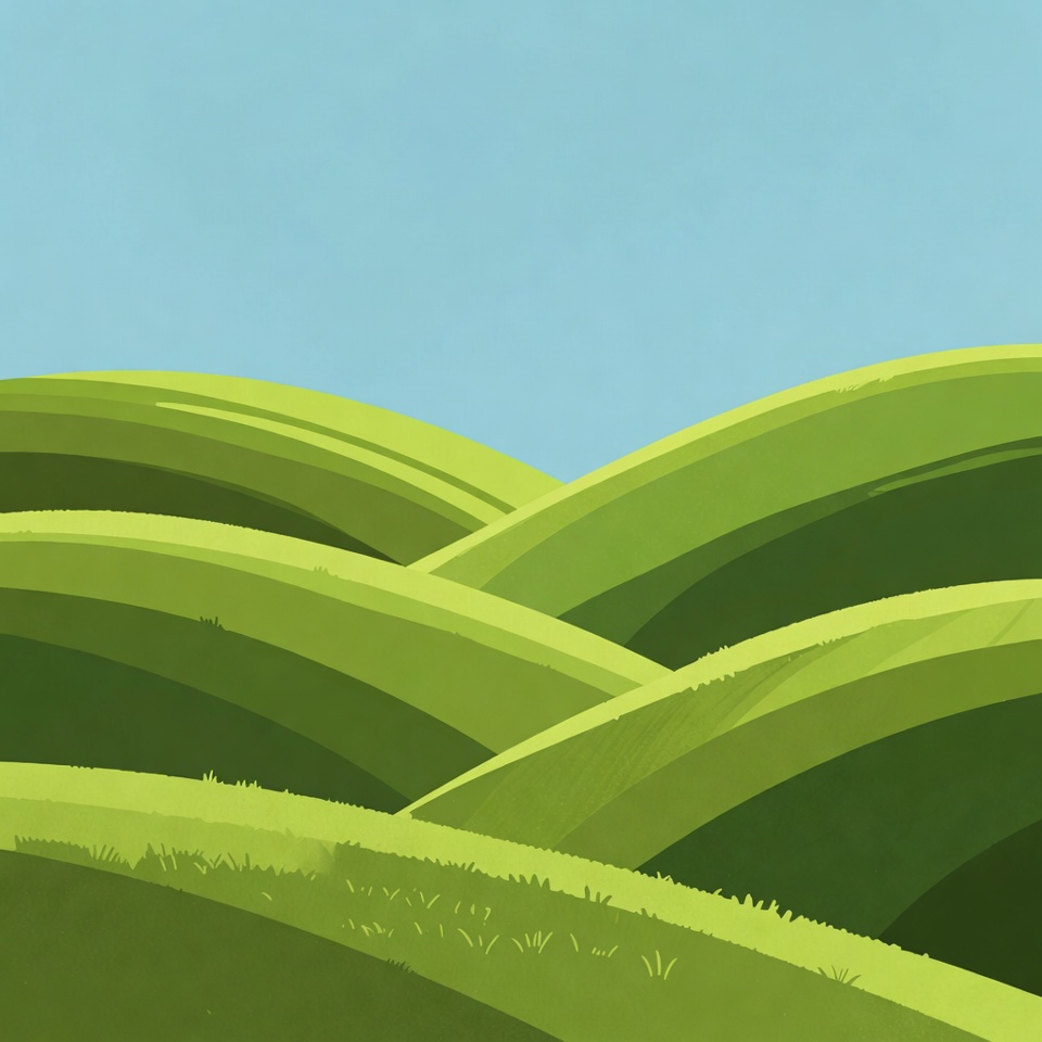 Vast green hills stretch across the landscape under a clear blue sky. The gentle curves create a smooth surface in nature.