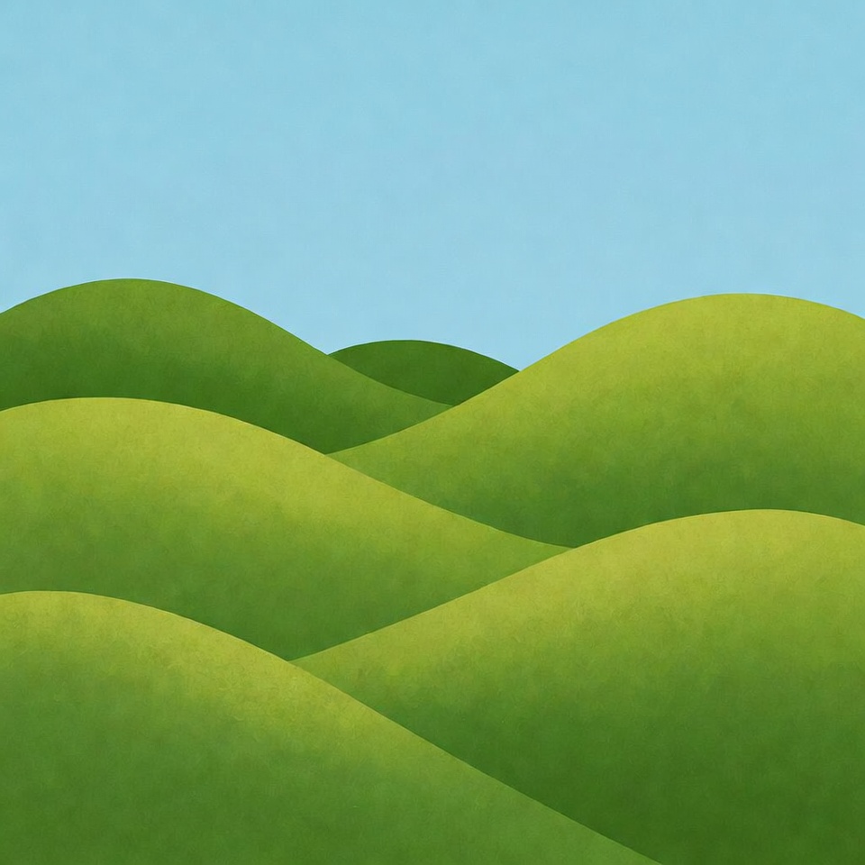 Green hills stretch across the landscape with a clear blue sky above, showing a simple natural scene in daylight.