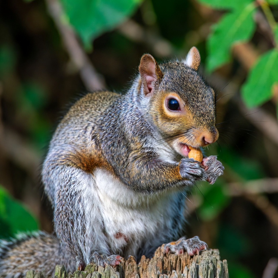 A squirrel sits on a wooden trunk, eating a nut. Green leaves surround the scene in a natural setting.
