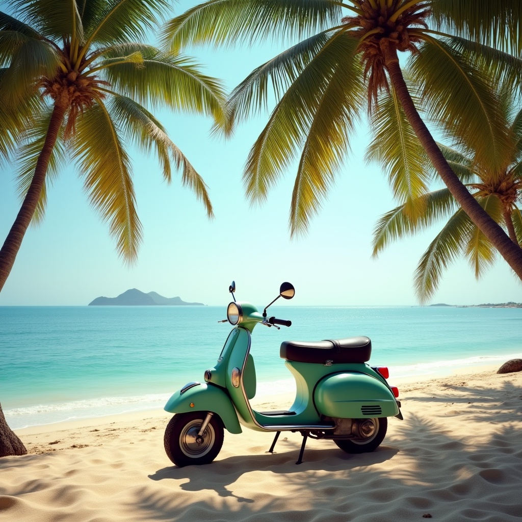 A vintage scooter is parked on sandy beach under palm trees, with clear blue water in the background during a sunny day.