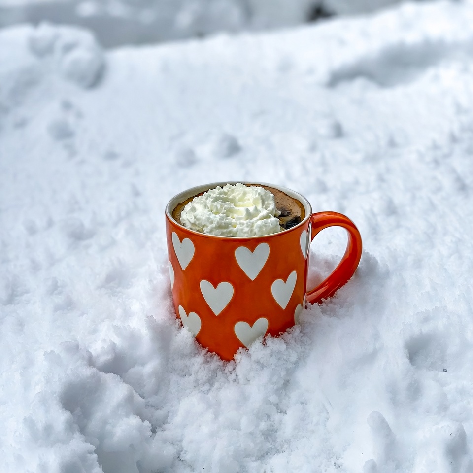 beverage, cold day, cold weather, comfort, cozy, cream, drink, frozen, hearts, hot chocolate, hot drink, marshmallows, mug, orange cup, outdoors, seasonal, snow, white snow, winter, winter scene
