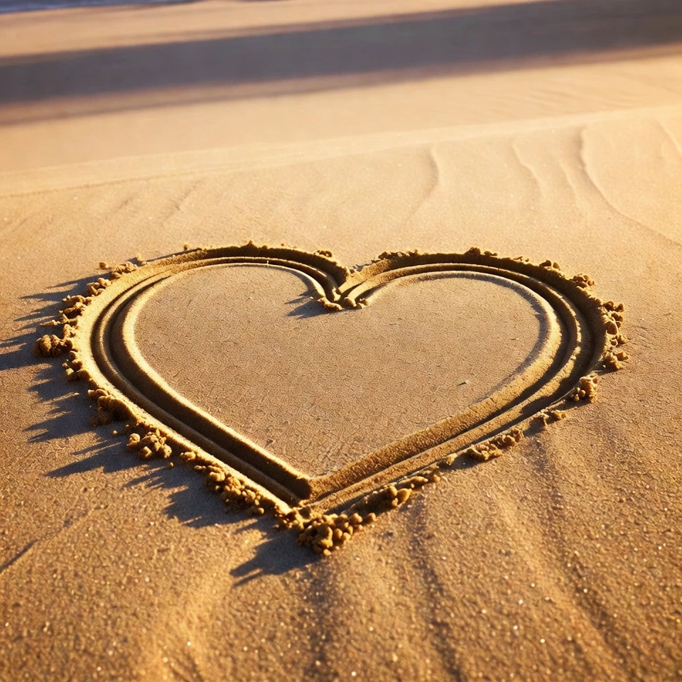 Heart shape is formed in the sand on a beach, with the sun shining down and soft waves in the background. The scene shows a simple love symbol.