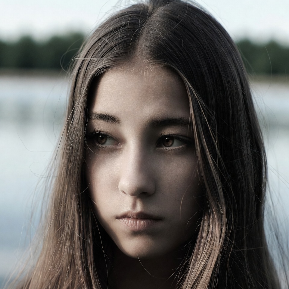 A young girl stands near the water with a serious expression. Her long hair flows in the breeze as she gazes into the distance.