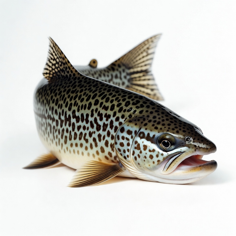 Two trout are placed on a white surface, showing their detailed body and patterns. The fish are still and prominently displayed for observation.