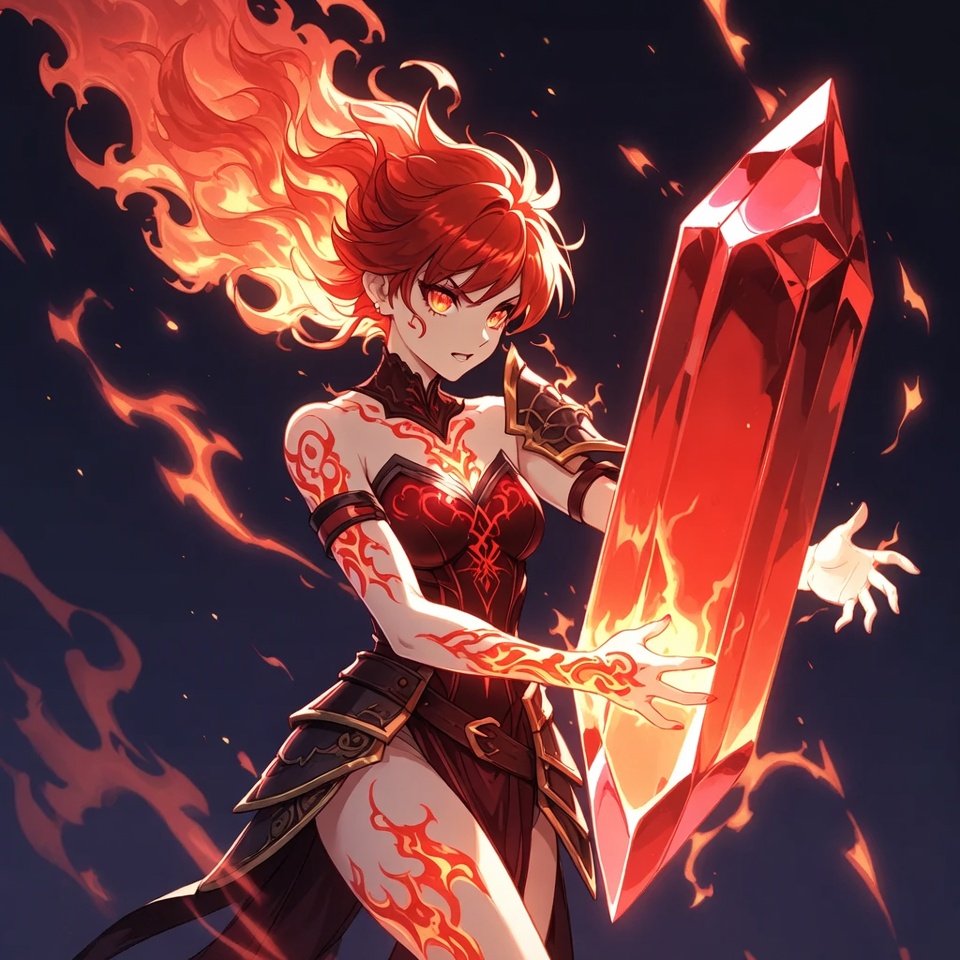 animation, artwork, battle, character, costume, crystal, energy, fantasy, fire mage, flames, glowing, heat, hero, light, magic, power, red, sorcery, spell, symbols