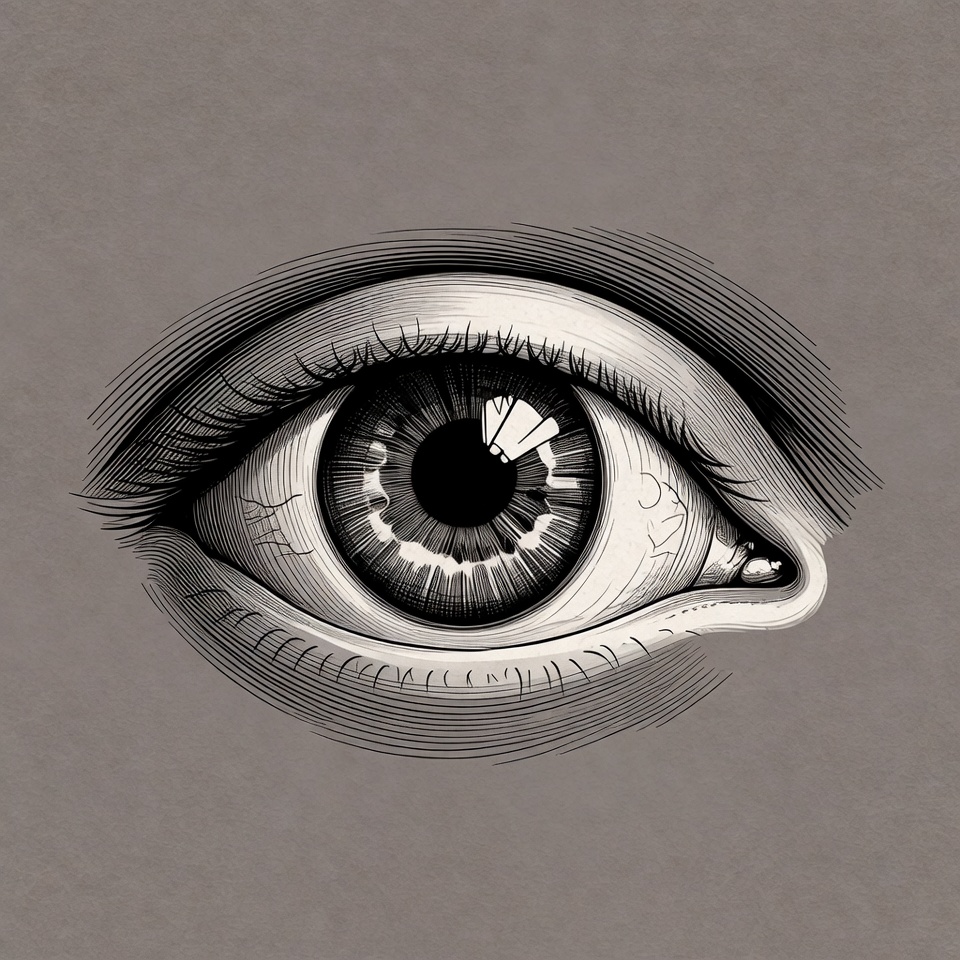 An artistic drawing of a human eye shows intricate lines and patterns, highlighting the iris and pupil in black and white.