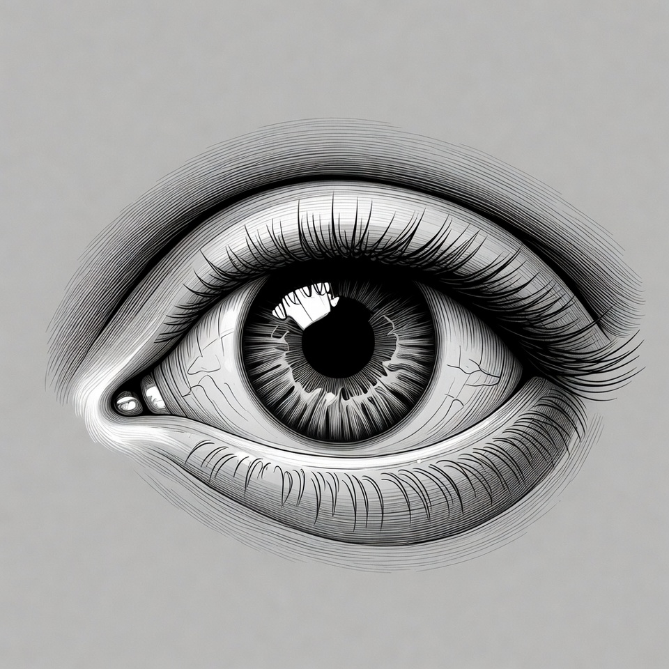 A black and white drawing shows a detailed human eye. The focus is on the texture and shape of the eye, conveying a sense of depth.