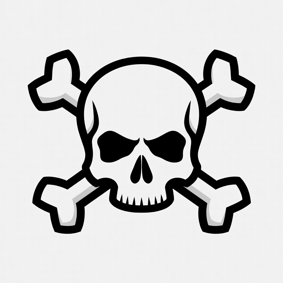A skull and crossbones symbol often used to represent danger or poison. It features distinct lines and shapes against a plain background.