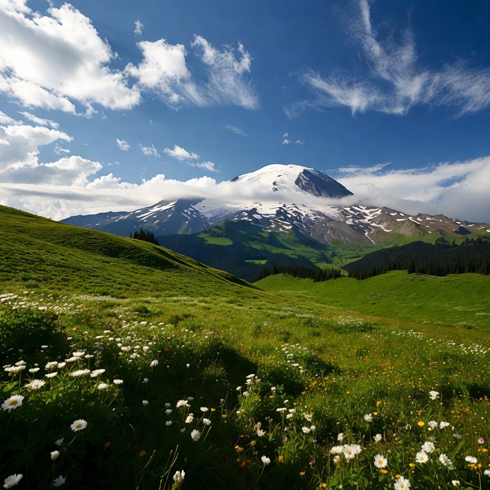 Snow-capped mountain stands tall against a blue sky with clouds. Green fields with flowers stretch across the land below.