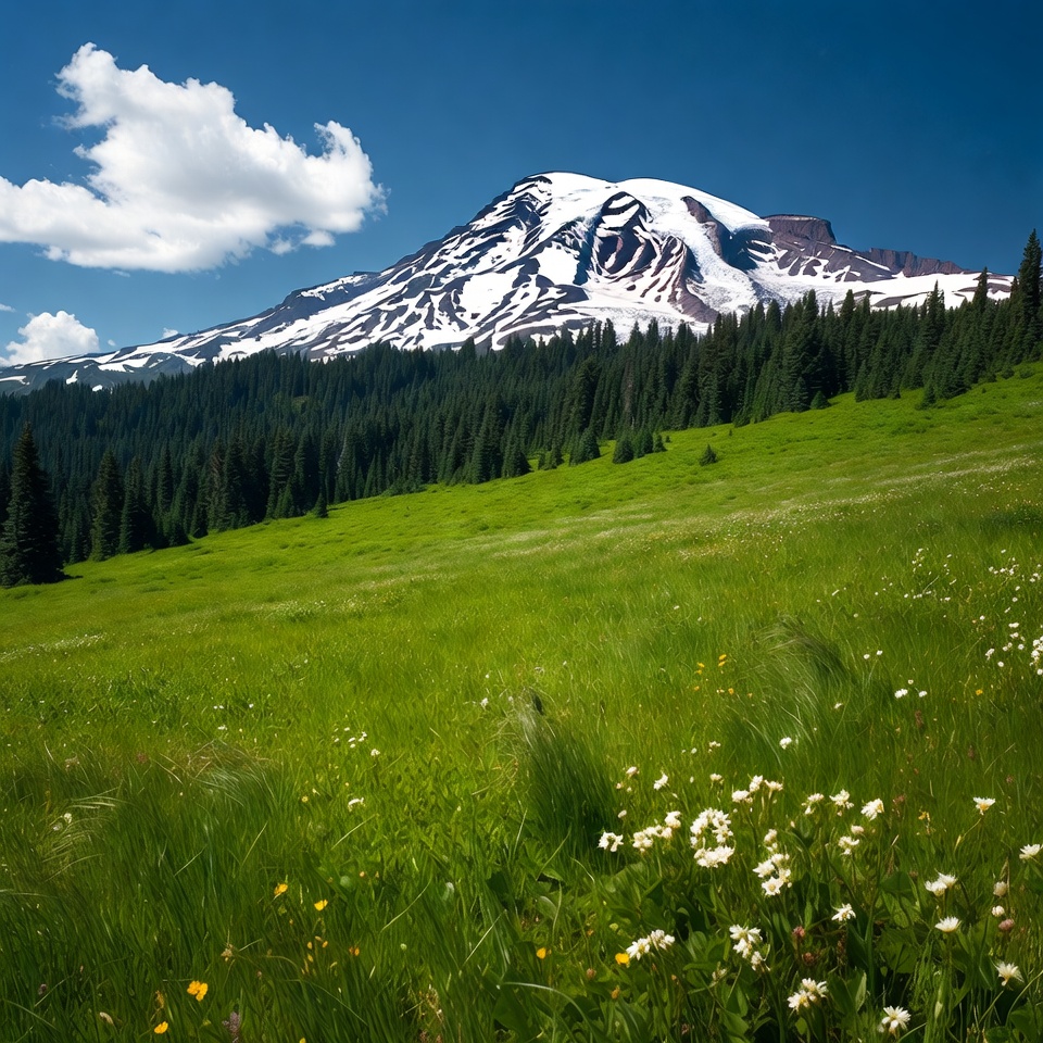 A snowy mountain rises above a green field filled with flowers. The clear sky has a few clouds suspended above the scene.