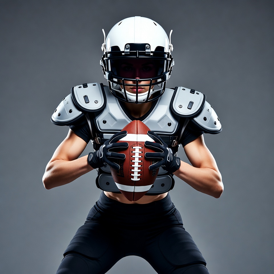 A female athlete prepares to throw a football while wearing protective gear. The background is neutral, highlighting her focus and determination.
