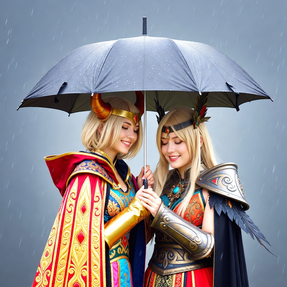 Two cosplayers in detailed costumes smile under a black umbrella as rain falls in the background. They enjoy each other's company during the event.